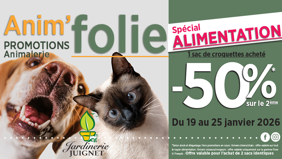 *Selon stock et étiquetage. Hors promotions en cours - Univers chiens/chats : offre valable sur tout le rayon alimentation. Univers oiseaux/rongeurs : offre valable uniquement sur la gamme Pure
